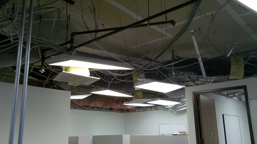 We were told that this week we would have our ceiling panels replaced with new “tiles” and a metal grid, but the disruption to us would be minimal. I really thought that I knew what that meant, but when I came in to see a missing ceiling and the lights hanging on with string and guts-hanging-out pipes and wires, I was a bit shocked. An office ceiling is nothing like my childhood unfinished basement.